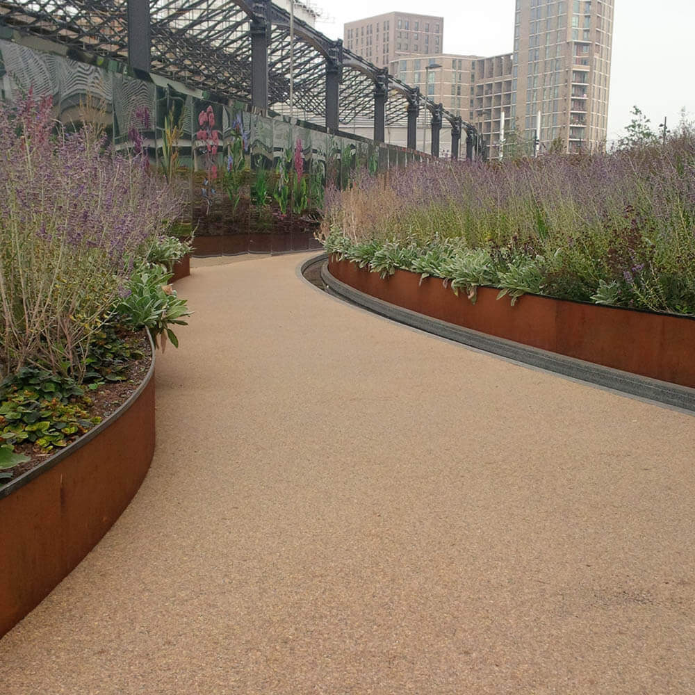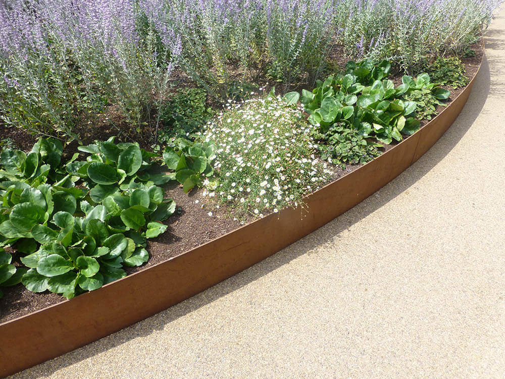 De Brink-afboording springt in het oog en laat schoonheid en kracht samengaan. Voor de 6 mm dikke staalplaat kies je uit een waaier aan afwerkingen en kleuren. Zo kan je een esthetische keuze koppelen aan een sterke, duurzame afboording die als keerwand hoogteverschillen kan opvangen of creëren, in een strak of organisch ontwerp. Dankzij maatwerk wordt je ontwerp niet beperkt door vaste afmetingen. Driehoeksteunen met voetplaat zorgen voor een eenvoudige en stevige installatie.